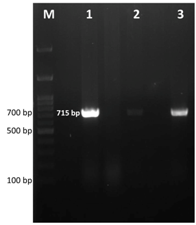 Figure 2 Gel electrophoresis image of Mycoplasma sp. specific PCR products. Lane M- 100bp ladder, Lane 1, 2, 3- positive samples showing expected band size at 715bp.