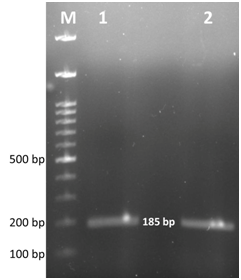 Figure 3 Gel electrophoresis image of Mycoplasma gallisepticum specific PCR products. Lane M- 100bp ladder, Lane 1, 2- positive samples showing expected band size at 185bp.