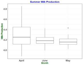The distribution of milk production data for the months of April, May and June were analyzed through boxplot. The plots help in understanding the distribution trend, central value, and variability of the monthly data.