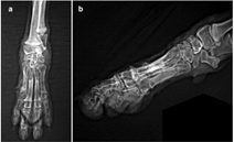 A four-months-old, female, crossbreed dog was presented with complains of acute pain and lameness of the left forelimb after jumping from a height and landing on its’ front legs. The owner reported that the injury had occurred just 30-minutes before presentation. On presentation the dog was bright, alert and responsive but painful. The general clinical examination was unremarkable apart from increased heart rate of 170beats per minute (ref. 65–140) and increased respiratory rate of 45breaths per minute (ref. 10–35), findings that were deemed consistent with the presence of underlying acute pain. The orthopaedic examination of the right forelimb was unremarkable. Examination of the left forelimb revealed acute pain with a score of 24 at the Glasgow Short Form Composite Measure Pain Scale (CMPS-SF),1 and gait assessment revealed non-weight bearing lameness of 10/10,2 with concurrent non-reducible swelling of the distal antebrachium and carpus that extended to and included the metacarpal region. There was also presence of moderate crepitus at the metacarpals and distal limb valgus. No neurological or proprioceptive deficits were observed during neurological examination. The left scapula, humerus, elbow and proximal antebrachium were evaluated and the examination was unremarkable.