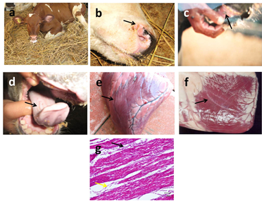 Clinical signs of FMD were fever, ropy salivation (Figure 3a) with slobbering, smacking of lips and lameness in all infected calves. Skin vesicles and ulcers were detected on nostrils (Figure 3b), muzzle, gum (Figure 3c), tongue (Figure 3d), feet in 100% of calves and on teats in 50% of calves. The mortality rate was very low (5%) except in suckling animals reaching (100%) as a result of myocardial damage. In those cases, inappetence to anorexia, dullness incoordination, recumbency, tachycardia and tachypnea were recognized prior to death. Yellowish (Figure 3e) to grayish (Figure 3f) streaking bands were observed on myocardium of dead calves giving the characteristic tiger heart appearance. Histopathological examination of skin of muzzle revealed focal destruction of epithelial and subepithelial structures with the presence of inflammatory cells, which reveals lesions of necrotic and ulcerative dermatitis. No inclusion bodies can be detected in any infected calves. Myocardial hyalinization and coagulative necrosis was observed in dead calves with interstitial edema and mononuclear cells infiltration (Figure 3g).