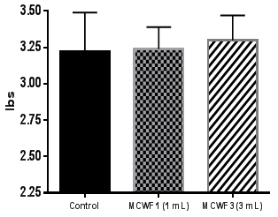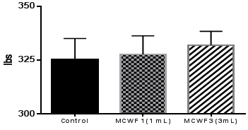 Data analysis from individual pens at the end of the study demonstrated that both MCFW 1 and MCWF 3 groups had a significant decrease in morbidity (24% and 62% respectively; p<0.05) compared to control calves (Figure 1). Additionally, the MCWF 3 group had a 44% decrease in number of pulls compared to the MCWF 1 group (p<0.05). Furthermore, the mortality rate was also reduced in the MCWF groups compared to controls (Figure 2), but did not result in statistical significance due to an overall low mortality rate. Analysis of the treatment costs revealed that calves receiving 1mL or 3mL of MCWF by subcutaneous administration on arrival had an average treatment cost of USD 7.92 and USD 4.54 respectively, while treatment costs in the control group were USD 13.03 (Figure 3). This represented a 66% decrease in total medical costs in the MCWF 3 group compared to controls (p<0.05) (Figure 4). Calves in both MCWF groups required fewer treatment days and less antibiotic use compared to control calves, resulting in a 62% less morbidity and 54% decrease in treatment costs (Controls compared to 3mL) (Figure 4). Calves receiving 3mL of MCWF by subcutaneous administration on arrival gained an average of 7.4 pounds more than control calves over the 102day feeding period (Figure 5). This represented a 0.11pound increase in ADG (Figure 6). Overall, calves receiving 3mL MCWF by subcutaneous administration on arrival demonstrated superior health performance than calves receiving only 1ml or no MCWF. Overall, Amplimune™ treated calves had significantly less morbidity and less antibiotic cost than control calves (Table 2).