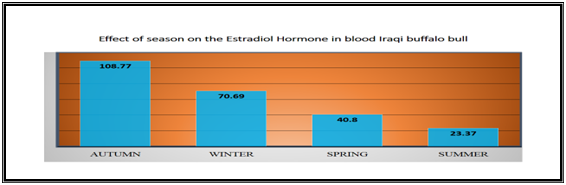 The mean level of estradiol hormone in blood serum in autumn (108.77±17.23) p.mol/L, winter (70.69±7.21) p.mol/L, sprig (40.8±8.37) p.mol/L and summer (23.37±3.27) p.mol/L The statistical analysis showed significant variation (p<0.05) between the level of the hormone through the different seasons of the year (autumn, winter, summer).that the highest level of the estradiol in the autumn, there are no signification variation between (winter, spring). Table 1 & Figure 2.