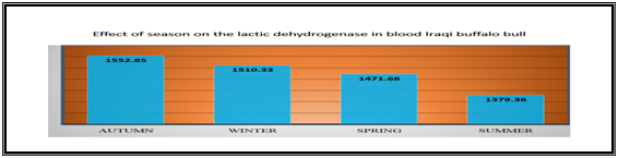 In Table 2 & Figure 5 showed the level of Lactic dehydrogenase in blood serum in autumn was (1552.85±82.55) U/L, winter (1510.33±140.39) U/L, sprig (1471.66±146) U/L and summer (1379.36±57.9) U/L. The statistical analysis showed no significant variation between the level of the lactic dehydrogenase through the different seasons of the year and that the highest level of the lactic dehydrogenase was in autumn, summer and followed by spring and the lowest level was in winter.