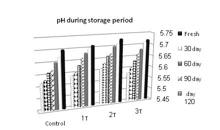 pH results of processed cheese trails made with different substitution levels of milk protein replacer during storage period were presented in Figure 1. Generally pH of all treatments values (Figure 1) was higher than control in the beginning and end of storage. At pH values and dry matter content enables comparing the effect of different concentrations of milk protein replacer used because both pH and dry matter influence the consistency of processed cheeses.15-17 All treatments moisture contents were higher than control in the beginning and end of storage. On the other hand treatment 2 retained highest moisture contents comparing with the rest of treatments; this may be due to the hydrophilic nature of these proteins Rani & Verma.18