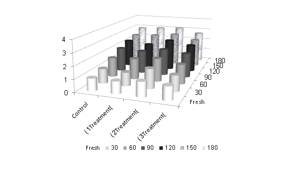 Total bacterial count, molds, yeast and anaerobic spore former in formulated processed cheese. Total bacterial count slightly changed among treatments. It was ranged from 1.0 x 10³ to 1.2 x 10³. Total count was gradually increased with the progress of storage period (Figure 3). In general, total count was triplicated (from 1.0*10³ - 3.1*10³) by the end of storage period. The specified microorganisms (molds, yeast, and anaerobic spore former) were not detected in all cheese treatments. This low bacterial count and the absence of molds and yeast and spore former can be attributed to the controlled hygienic condition and also to heat treatment.24 This low microbial content can be characterized the formulated cheese as good microbiological quality processed cheese. These results are in accordance with Muir et al.,25 Nour El-Dia. Kung et al.,26 reported slightly higher values of aerobic plate count (<1 – 4.56 Log10 cfu/gm) and total coliform bacteria (<3 – 30 MPN/gm) than those reported in the present study.
