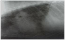 Figure 3 Mammary adenocarcinoma: Lateral thoracic radiograph showing metastatic lung lesions: Multiple nodular soft tissue densities through out the lungs.