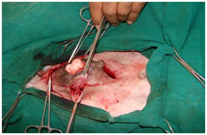Surgery being the mainstay of the management for canine mammary tumours, simple or regional mastectomy (Figure 4), (Figure 5), (Figure 6) was performed in all cases in the present study and chemotherapy was not used because the results have, historically, been disappointing.26 Simon et al.27 reported that although dogs treated with chemotherapy had a tendency toward higher long-term local control and survival rate but there was no significant difference in the recurrence free interval, time to metastasis and overall survival with surgery alone or in combination with adjuvant chemotherapy. Gupta et al.21 also did not find significant difference in the mean survival time and survival rate between the dogs treated by surgery alone or surgery followed by chemotherapy. Low rate of death (reported in three animals) and recurrence (noticed in one case) during the study period might be due to the fact that the post operative period of follow up of only 3-12 months was less, as Bostock28-32 reported that animals with benign tumours had mean survival time of at least 114 weeks and those with malignant tumours survived for 70 weeks. Currently there is no surety way to prevent mammary tumours in dogs but several things may help to reduce that risk. Among them, spaying a bitch before her first heat cycle is strongly protective against breast cancers in canines. Some authorities recommend not to bred females with history of mammary tumours as it may have hereditary association.