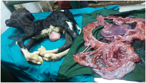 From case history and clinical observations, a pluriparus full term dairy cow in its 4th parity in third parity and full term pregnancy with history of dystocia brought to clinical veterinary hospital, Faculty of veterinary Medicine, Assiut University, Egypt, with history of straining since last 8 hours with no progression in parturition as well as it fails to make any progress towards delivery the water bag was already ruptured. The case was unsuccessfully handled by a local veterinarian. During manual obstetrical examination, the cervix was found open with the foetus in anterior longitudinal presentation, dorso-sacral position and revealed ‘hydrocephalus’ condition in fetus, having excessive swelling over the head. Palpation of the foetus revealed absence of reflexes suggestive of dead foetus with ankeloysis in limbs (Figure 1). On the basis of clinical observations, the case was diagnosed as dystocia due to foetal hydrocephalus tentatively which could only confirmed after delivery of the foetus. To manage this dystocia, caesarean section was performed. Under local and high caudal epidural anaesthesia, caesarean-section was performed on the left flank region, adopting the standard operating procedure and the cow was positioned at standing condition In this study, the incidence of hydrocephalus in dairy cattle reported as 0.73 % from all cases of dystocia from 2007-2015 which represented in to clinical veterinary hospital, Faculty of veterinary Medicine, Assiut University, Egypt. However, according to fetal causes of these cases, this incidence became 1.41%. Congenital defects may be defined as any defect in the foetus present at birth which commonly diagnosed by veterinary practitioners. The incidence and types of congenital defects are highly variable depending primarily on the number and types of cases submitted to veterinary faculties from those actually occurring on farms and field and observed by veterinary practitioners, which are not submitted.5