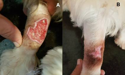 Figure 1 Diazepam extravasation injury in a male dog breed West Highland White terrier. A. Deep skin ulceration due to extravasation of diazepam. B. Resolution of the lesion after 30 days of pharmacological treatment. Font: Errante, 2023.