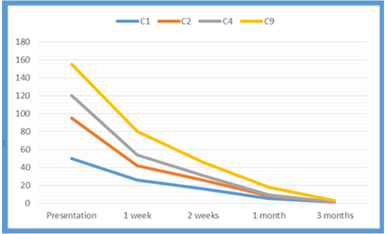 The chosen medication was Lamuvudine, at a dose of 20 mg/kg bid. All the cats were monitored during the treatment and any toxicity signs were not observed for lamivudine in any of the cats. Lamuvudine was continued for 3 months in each patient and stopped once the animal has become clinically normal. The prognosis was determined by improvement of clinical signs, curing of chronic bacterial infections, FBC and by differential cell count with regard to lymphoblast percentage reduction in blood smear. Differential counts were observed every 7-10 days to monitor the prognosis. The percentage of lymphoblasts has reduced drastically within one month of the treatment. Follow-ups of these patients were performed monthly until recovery. The secondary infections, constipation and emaciation had resolved in all cats except 2 which were deceased. C3 was deceased due to septicemia after 10 days of admittance and c7 due to kidney disease. Reduction or no lymphoblast counts were seen in blood smears of C1, C2, C4 and C9 (Figure 4).
