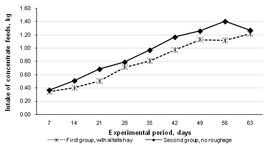 Intake of feed and dry matter in the lambs fed alfalfa hay was by 7% higher than those in the other group (Table 2). The lack of alfalfa hay in lambs from the second group was the reason for the higher intake of concentrate throughout the experimental period (Figure 1), which has led for the higher expense of concentrated feed and feed units for growth per kg gain (by 16.3%, Table 2).