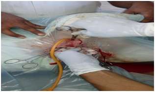 The present study was conducted on 9 male bovine calves (8-Cattle and 1-Buffalo) presented with history of anuria and anorexia. Detailed anamnesis regarding age, sex, duration of anorexia, abdominal distension and colic were noted in all calves under study. The heart rate (beats/minute), respiration rate (breaths/minute) and temperature (°F) were observed using standard techniques. The color of conjunctival mucus membrane was and degree of dehydration was assessed by skin tent test.5 Abdominal ballottement was performed by grasping the ventral abdomen and percussing with finger tip for the presence or absence of fluid thrill. Abdominal paracentesis was performed using sterile 18G needle at paramedian site on either side of glans penis in standing animals. Ultrasonographic examination using 3.5 -5MHz convex transducer in real time B-mode was conducted by placing the animal in dorsal recumbency with the transducer just anterior to pubis in both transverse and longitudinal planes. Jugular venous blood was collected before surgical intervention and on 12th post-operative day to estimate the blood urea nitrogen and creatinine from serum using standard kits (Beacon, India). For modified tube cystotomy, in eight animals caudal paramedian laparotomy was conducted, while in one case with ruptured urethra the intact bladder was approached through left caudal flank laparotomy under linear infiltration with 2 per cent lignocaine hydrochloride. The ruptured urinary bladder was carefully exteriorized and examined for presence of any calculi. A 18 no Foley’s catheter was passed into the abdominal cavity through a separate single stab incision approximately 5 cm lateral to the laparotomy incision site (Figure 1). The Foley’s catheter was then passed into the urinary bladder through a stab incision and retained inside the bladder by inflating the bulb with 3ml normal saline and by placing a purse string suture on the bladder around the point of insertion (Figure 2). Cystorrhaphy was performed (7 cases) using chromic catgut 2-0 in single layer Cushing suture pattern. The laparotomy incision was closed in routine manner and the Foley’s catheter was fixed on ventral abdominal skin using interrupted sutures with silk no 2 (Figure 3). Routine postoperative antibiotic, anti-inflammatory and fluid therapy was followed. In addition, feeding of ammonium chloride 5gm total dose daily up to 10 days was carried out. The sutures were removed in all calves on 12th post-operative day. The Foley’s catheter was removed after deflating the bulb and pulling it out from abdomen on resumption of normal urination.