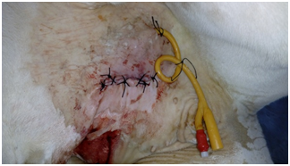 The Serum blood urea nitrogen and creatinine revealed higher values (Table 2) than reference range prior to surgical intervention, which were near to normal reference range on 12th post-operative day. The higher values were probably due to acute renal failure owing to back pressure of urine on kidneys and absorption from peritoneal cavity.2,8 Kerr9 reported that variation in creatinine and blood urea levels could be used for early diagnosis and recovery from obstructive urolithiasis as observed in current study. Tube cystotomy along with calculolytic agent like ammonium chloride was proven effective for recovery from complete urinary obstruction without any postoperative complications in calves. For modified tube cystotomy, the caudal paramedian incision site was convenient to approach the bladder in eight calves. The 18 number Foley’s catheter was inserted directly in the abdominal via a separate single stab incision at extreme paramedian site without creating a subcutaneous tunnel (Figure 1) thereby reducing the total operative time and the tissue damage. However, routine tube cystotomy as described by Parrah et al.,2 Kushwaha et al.,3Tamilmahan et al.6 and Khurma et al.,4 involves creating a subcutaneous tunnel for the foleys catheter fixation prior to its introduction in abdominal cavity. The subcutaneous tunnel is probably created to provide anchorage to the Foleys catheter to prevent its accidental dislodgement. In the calf having urethral rupture and subcutaneous urine infiltration a caudal left flank incision was used to approach the urinary bladder and the Foley’s catheter was passed through separate stab incision at lower left caudal flank (Figure 6). Ammonium chloride is a urinary acidifier and along with tube cystotomy has a synergistic effect for quick recovery as suggested by Kushwaha et al.,3 Parrah et al.,2 and Tamilmahan et al.6 Complication of tube cystotomy like blockade of tube with blood or tissue debris, urethral rupture, tube dislodgement and infection have been reported by different authors.2,6 These complications were not observed in any of the calves under study, probably as the Foleys catheter was directly inserted in the abdominal cavity by single stab incision without making any subcutaneous tunnel. This prevented excessive bending of catheter thus avoiding above complications. The normal urination was resumed in 5 calves on 10-12 postoperative days and in 4 calves after 15 days of surgery with removal of Foley’s catheter.