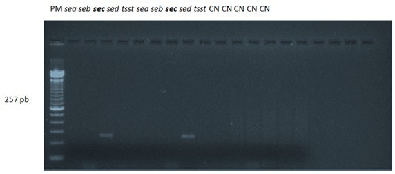 The occurrence of Staphylococcus coagulase positive was detected in 19 of the 24cheeses analyzed (80%). 100% of the Staphylococcus coagulase positive isolated were confirmed as Staphylococcus aureus. The qualitative immunoenzymatic detection showed the absence of enterotoxins production in all 19 cheeses studied Staphylococcus aureus positive, even in those with counts higher than 5 log ufc/g (30% of the cheeses), which exceed the EC Regulation.2 One of those cheeses was elaborated from pasteurized milk. This is an evidence of crossing contamination during the processing and/or handling deficiencies. Our results are even lower than those obtained by Sampaio and Nader Filho23 in Brazilian cheeses (Mato Grosso) where a 50% of the samples showed bacterial counts higher than those allowed by their legislation. Regarding to the identification of enterotoxins encoding genes, four cheeses (21%) were positive to sec gen Figure 1, the only SE gen detected. It is prevalence lower than that found by Arcuri et al.,24 in which a 72.9% of Staphylococcus aureus isolated bear SEs genes. In our work sec gen was found in higher frequency in Staphylococcus aureus isolated from cheeses elaborated from raw milk. This fact agrees with Hunt et al.,25 who reported on raw milk used for raw milk cheese 26 isolations from only one supplier containing the sec gene and producing SEC, although 83.2% of the isolations did not contain the SEs genes or the toxin producing capability tested for. Scherrer et al.,26 verified the occurrence of this gen in a 14.6% of the strains de Staphylococcus aureus from goat milk. Also for Kav et al.,27 the most commonly toxin gen detected in white-brined Urfa cheese was sec (25% of tested strains), as well as in the case of Akineden et al.,28 from goat’s milk cheese. Ostyn et al.,29 obtained the occurrence of one or two toxins by ELISA test in a 77% of the cheeses studied, and SED was the toxin most frequently identified (87%). In this last work, the occurrence of sed gen was detected by PCR in a 84.6% of the samples. Gutiérrez et al.,30 reported different results, in which 11 from 20 samples (55%) showed groth ion Baird Parker agar. Only a 20% of them were identified as Staphylococcus aureus, after coagulase test. And only a 5% produced SEA. Gücükolu et al.,31 detected the presence of genes encoding the staphylococcal enterotoxins SEA, SEC, and SED from cheeses samples in Samsun province of Turkey. In our work, where staphylococcal enterotoxins were not found directly from the cheeses, PCR demonstrated to be an important tool to supply complementary information about the toxigenic potential of the material studied. In fact, Ostyn et al.,29 consider the importance of molecular techniques to identify the occurrence of toxigenic strains in foods, because immunoenzymatic assay usually confirms the detection of toxins in foods with counts higher than 105cfu/g. In that sense, it is plausible that the counts of Staphylococcus aureus were not enough to produce enterotoxins. Taking into account the occurrence of Staphylococcus aureus genetically viable to synthesize them,32 it is demonstrable the extremely importance of the performance of desirable quality criteria, and also to assure the proper hygiene measures and practices in the raw material processing at the cheese farms in order to guarantee the quality and safety of the final product.