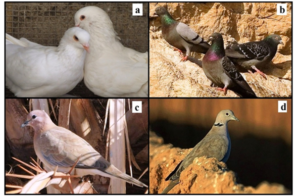 Figure 1 Examined Birds: A pair of Domestic Pigeons (Columba livia domestica) examined in study (a), Rock Pigeons (Columba livia) with grey color in most of birds (b), Laughing Dove (Spilopelia senegalensis) with light/dark brown color (c) and Eurasian Collared Dove (Streptopelia decaocto) with light grey color and collar in neck (d).