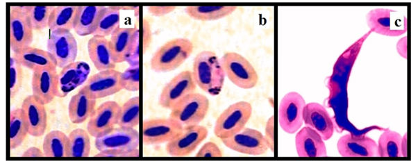 Figure 2 Identified blood parasites: Macro-gametocyte of Haemoproteous columbae in the infected erythrocytes shown in center of picture (a), micro-gametocyte of Haemoproteous columbae in the infected erythrocytes shown in center of picture (b) and Leukocytozoon marchouxi with conical shape shown among erythrocytes (c).
