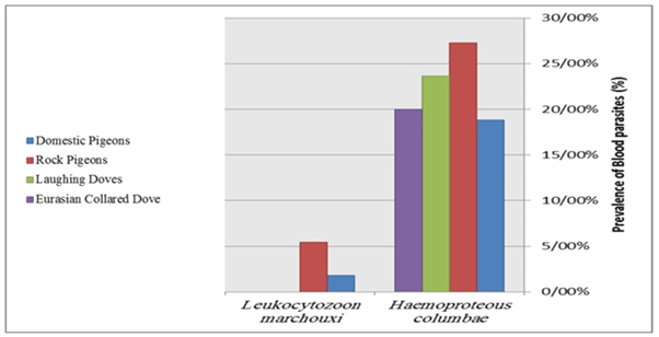 Examination of birds for blood parasites shows that there are infections by two species of blood parasites in examined groups: Haemoproteous columbae and Leukocytozoon marchouxi (Figure 2). Occurrence and prevalence of identified blood parasites of each group are shown in Table 1. There is significant differences between the prevalence of Haemoproteous columbae and Leukocytozoon marchouxi in examined groups, the highest prevalence of Haemoproteous columbae is for Rock pigeons and the lowest prevalence of Haemoproteous columbae is for Domestic Pigeons, also the highest prevalence of Leukocytozoon marchouxi is for Rock pigeons and the lowest prevalence of Leukocytozoon marchouxi is for Domestic pigeons (Figure 3).