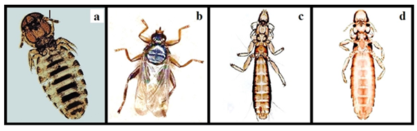 Figure 4 Identified ectoparasites: Menopon gallinae (a), Pseudolynchia canariensis (b), Columbicola columbae (c) and Lipeurus caponis (d).