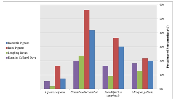 Doves and pigeons are different genus of columbidae family, Columbiformes order.1 They are ubiquitous birds and can be found in virtually every town and city around the globe.2 Pigeons are related to human since ancient time, they live side by side with human as a source of food, hobby and experimental purposes.3 Parasites are regarded as the basic causes of retardation in growth, lowered vitality and poor conditions of the birds. They can affect bird's health directly by causing irritation, discomfort, tissue damage, blood loss, toxicosis, allergies and dermatitis which in turn reduce the quality and quantity of meat and egg production.4