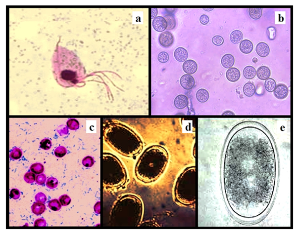 Figure 6 Identified protozoan, oocysts and egg of helminths: Trichomonas gallinae (a), Eimeria labbeana Oocysts (b), Cryptosporidium meleagridis Oocysts (c), Ascaridia columbae Eggs (d) and Ascaridia galli Eggs (e).