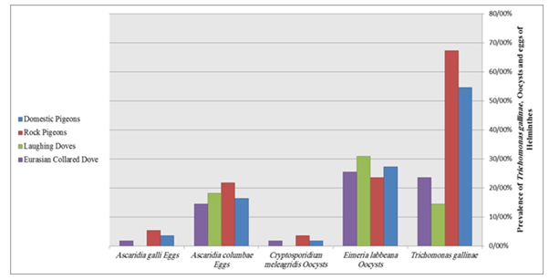 After the doing of three different types of qualitative tests on feces samples; namely direct smear, flotation and sedimentation techniques, the identified protozoan oocysts (Figure 6b&c) and helminthes eggs (Figure 6d&e) are listed in Table 4. There is significant difference between prevalence of identified oocystes and eggs of helminthes in different groups (Table 3). The highest prevalence of Eimeria labbeana (Coccidia) Oocysts is for Laughing Doves and the lowest prevalence of Eimeria labbeana Oocysts is for Rock pigeons, the highest prevalence of Cryptosporidium meleagridis (Coccidia) Oocysts is for Rock pigeons and the lowest prevalence of Cryptosporidium meleagridis Oocysts is for Laughing Doves, the highest prevalence of Ascaridia columbae (Nematoda) Eggs is for Rock pigeons and the lowest prevalence of Ascaridia columbae Eggs is for Eurasian collared Doves, the highest prevalence of Ascaridia galli (Nematoda) Eggs is for Rock pigeons and the lowest prevalence of Raillietina tetragona is for Laughing Doves (Figure 7).