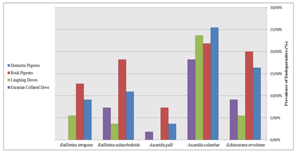 After the evisceration process and examination of every group, some helminthes were removed from gastro-intestinal tracts of examined birds (Figure 8). Table 4 show the occurrence and prevalence of endoparasites in gastro-intestinal tracts of examined birds, the highest prevalence of Echinostoma revolutum is for Rock pigeons and the lowest prevalence of Echinostoma revolutum is for Laughing Doves, the highest prevalence of Ascaridia columbae is for Domestic pigeons and the lowest prevalence of Ascaridia columbae is for Eurasian collared Doves, the highest prevalence of Ascaridia galli is for Rock pigeons and the lowest prevalence of Ascaridia galli is for Laughing Doves, the highest prevalence of Raillietina echinobothrida is for Rock pigeons and the lowest prevalence of Raillietina echinobothrida is for Laughing Doves, the highest prevalence of Raillietina tetragona is for Rock pigeons and the lowest prevalence of Raillietina tetragona is for Eurasian collared Doves (Figure 9).