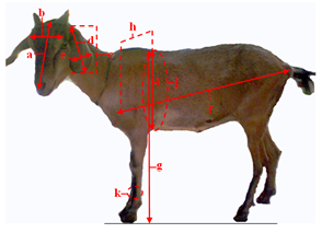Figure 1 Scheme of body measurements in the Katjang doe consisted of face length (a), face width (b), face height (c), ear length (d), ear width (e), body length (f), withers height (g), chest width (h), chest depth (i), chest girth (j) and cannon bone circumference (k).