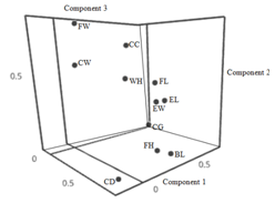 Figure 3 Component plot of body measurements in the Katjang does in rotate space consisted of face length (FL), face width (FW), face height (FH), ear length (EL), ear width (EW), body length (BL), withers height (WH), chest width (CW), chest depth (CD), chest girth (CG) and cannon bone circumference (CC).