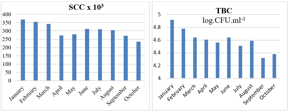 One of the methods of checking the established anti-mastitis measures and health status of the mammary gland of the dairy cows is the monitoring of somatic cells count (SCC) together with the total bacteria count (TBC) in raw milk.11 CC and TBC values recorded in monthly intervals, which are shown in Graph 1 and Graph 2, do not reflect the dynamics of mastitis prevalence. The discrepancy is also apparent at higher SSC values (369 and 350 x 103) a TBC (4.9 – 4.8 log.CFU.ml-1 from max. values 5), in the months of January to March, when the prevalence of mastitis was in the level of 53.6%-40.8% and should logically be related to their higher values above the maximum limit allowed. The mentioned contrast was explained in the anamnesis when the farmer used proactive separation of milk during milking to solve the economic valorisation of production.