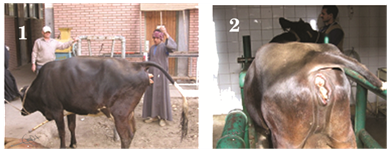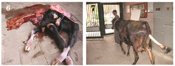 A pluriparus full term dairy cow in its 4th parity brought to clinical veterinary hospital, Faculty of veterinary Medicine, Assiut University, Egypt, with history of straining since last 6hours with no progression in parturition as well as it fails to make any progress towards delivery (Figure 1 & Figure 2). Per vaginal examination revealed fully dilated cervix as well as it may detect a disoriented fetus and palpated only a three fetal’s legs (Figure 3). To manage this dystocia, caesarean section was performed. Under local and high caudal epidural anaesthesia, caesarean-section was performed on the left flank region, adopting the standard operating procedure and the cow was positioned at standing condition (Figure 4 & Figure 5). The Schistosoma reflex us fetus was extracted out (Figure 6 & Figure 7).