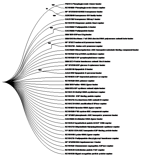 The variation in sequence length in base pair (bp) of CBPP protein ranges between 334bp and 1255bp (Table 1). The variation in sequence length in base pair (bp) of CCPP protein ranges between 364bp and 988bp (Table 2). Prediction of transmembrane helices of amino acid permease-bovine (NP975877) of cattle indicated twelve inside to outside helices and twelve outside to inside helices (Tables 3 & 4). The prediction plot is shown in Figure 1 with varying topologies of the transmembrane segments. Prediction of transmembrane helices of phosphoglycerate kinase-caprine (KEY8461) of goat indicated three inside to outside helices and three outside to inside helices (Tables 5 & 6). The prediction plot is shown in Figure 2 with varying topologies of the transmembrane segments. Figure 3 shows phylogenetic tree-like pattern used in describing the evolutionary relationships between the CBPP and CCPP proteins. Similar CBPP and CCPP proteins tend to cluster together compared to proteins that are distantly related in both species. This could be seen among others in the closeness of protein P62415-Phosphoglycerate kinase-bovine and KEY84661-Phosphoglycerate kinase-caprine.