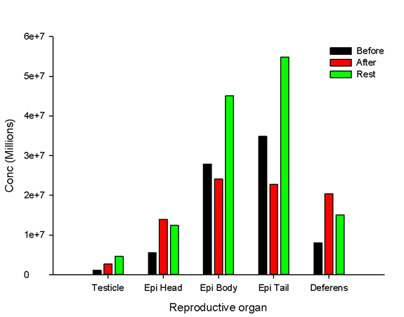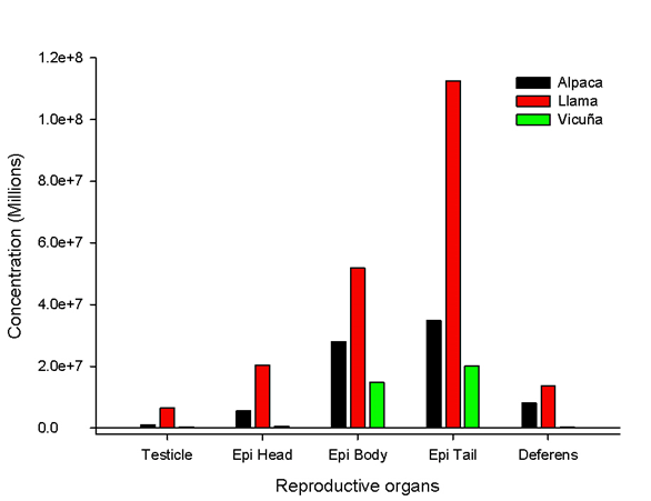 Spermatic concentration by species: There was a difference (P<0.05) in spermatic concentration and concentration by reproductive organs between llama, alpaca, and vicuna (Figure 4-6).