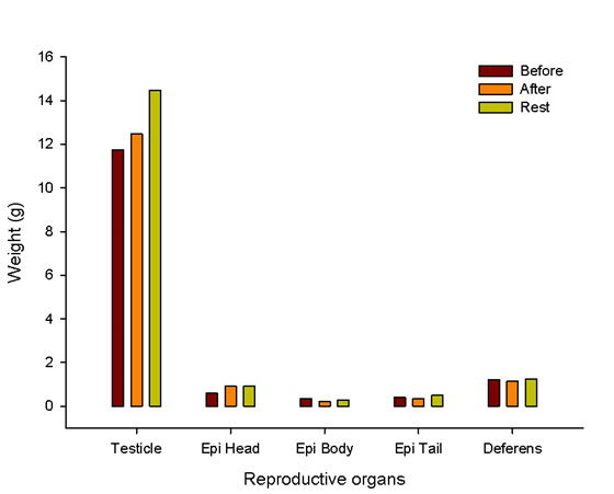Figure 2 Weight (g) of three different reproductive organs of the male alpaca under three observation periods, before and after breeding periods, and at the time of sexual rest.