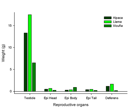 Reproductive organs by species: There were differences (P<0.05) in the weight of reproductive organs between llama, alpaca, and vicuna, Figure 5.