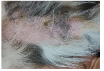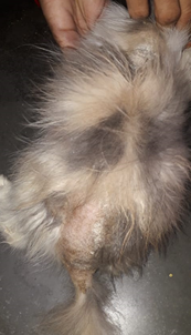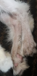 A Persian cat was presented with a history of hair fall and intense itching mainly on the spine of the body, legs and ear pinnae. The cat had decreased appetite, debilitated body condition and poor skin coat. Clinical exam revealed crusts and alopecia on ears, head, neck, spine of the body, tail and legs (Figure1&2), inflamed and self-inflicted lesions on the body due to intense itching (Figure 3). On clinical examination physiological parameters were within normal range.