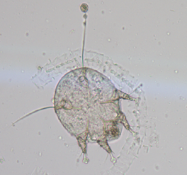 Diagnosed was made on the basis of presence of clinical signs such as, severe pruritus, crust formation, alopecia on the ears, neck, spine, tail and legs. For confirmation skin scraping was taken and processed that revealed presence of microscopic mite (Figure 4).