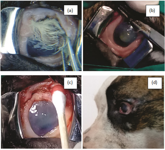 Figure 3 Photograph of the same dog. (a) Dermoid cyst with lateral corneo-conjunctival location in the left eye (LE). (b) Dermoid extraction was the surgical removal. (c) Corneal surface after dermoid extraction. (d) Post-surgical ophthalmic evaluation 4 days after the intervention.