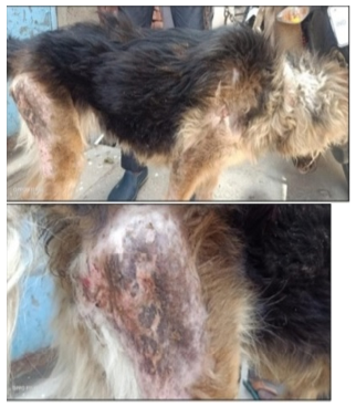 Figure 1 Picture of German shepherd bitch having hyper pigmentation, alopecia and diffuse purulent lesions showing dermatitis.