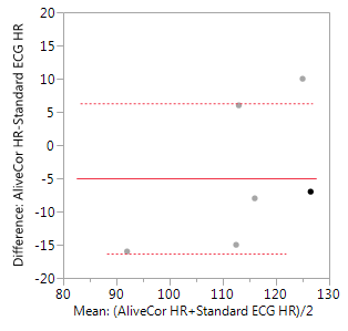 A Bland-Altman (Tukey Means-Difference) analysis was used to assess for significant difference between each calf’s average heart rate determined by the AliveCor device, the AliveCor reading as determined by the cardiologist, and the 6-lead ECG. ECG quality scores were compared via a matched pairs t test. This was done with a commercially available software program (JMP Pro 12, SAS; Cary, NC, USA). A p value of less than 0.05 was considered statistically significant for all values.