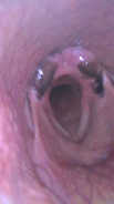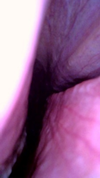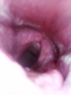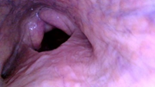 Figure 7 A collapse of the palatal arch, chondritis of the right cuneiform recess, epiglottic entrapment.