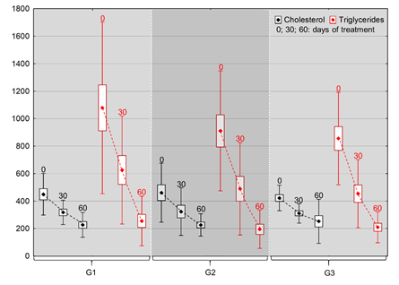 Figure 1 Mean values (points), with deviation (bars) and standard error (lines) of cholesterol and triglyceride levels after 30 and 60days of continuous omega-3 administration, categorized by dose (G1: 75mg/kg; G2: 100mg/kg, G3: 200mg/kg).