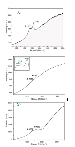Figure 5B illustrates the Raman spectrum of Sample-1916. Two peaks appeared in the range 1300~1700 cm-1, in which G peak appeared around 1593 cm-1 and D peak near 1385 cm-1, respectively. It can be judged the presence of graphite with structure defect, that is still cluttered graphite fragment in the carbon black particles, but there is a big difference between the degree of graphitization and the graphite particle size of the carbon black in Sample-1848. Figure 5C illustrates the Raman spectrum of Sample-2016. The main features of Raman spectrum are also the two strong peaks in the range of 1300-1700 cm-1, in which the higher wavenumber peak (G peak) appeared around 1602 cm-1 and the lower wavenumber peak (D peak) near 1372 cm-1. According to the reference, the main component of ink in Sample-2016 is graphite material with structural defects. Compared with ancient samples, their main difference is the intensity of the D-peak to the G-peak. When comparing the Raman spectra, it was found that all pigment compositions in three samples were carbon black.13 In general, the internal structural differences between carbon black and the well-crystallized graphite include relative rotation, wrinkle layer and disordering of interlayer spacing appeared in adjacent layers, which exhibit a significant effect on the Raman spectra. G peak of the Sample-1848, Sample-1916 and the Sample-2016 were at 1596cm-1, 1593cm-1 and 1602cm-1, respectively. The C-C bond force in the layer is weakened since the inter-layer van der Waals force weakens and the bond length of the C-C bond in the layer is shortened and the vibration frequency becomes higher. As the degree of disorder increases, the G peak of fully crystallized graphite broadens and shifts to high wave number. The degree of disorder in Sample-2016 is greater than the Sample-1848 and the Sample-2016 is minimal. Secondly, D peak of the Sample-1848, the Sample-1916 and Sample-2016 are at 1372cm-1, 1385cm-1 and 1372cm-1, respectively. The peak gradually increases as the degree of crystal order decreases. Therefore, the degree of order in the Sample-1916 is the highest, followed by the Sample-1848 and Sample-2016. The above results show that the degree of graphitization of carbon black in the ink of the Sample-1916 is the highest, followed by Sample-1848 and Sample-2016.
