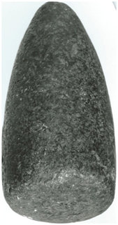 Shaw4 (Figure 11.21) illustrates nine conical stones which he observed during his fieldwork in Rossel Island from 2011 to 2012. They are similar in shape to the Rossel stones illustrated here in (Figure 4) (Figure 5) and measured from 6.3 to 13.6 cm in length. Shaw includes a tenth pounder among the conical stones, but its shape is so irregular that it was perhaps shaped by nature rather than humans. He also illustrates three cylindrical stone pounders (Fig. 11.22), which measured 7.4 to 10 cm in length. He (ibid. 326) suggests the cylindrical pounders are older than the conical ones and were replaced by the latter because their conical shape makes them easier to use. Shaw (ibid. 324) reports that ‘no complete pounders were found in excavations’ and that the thirteen pounders mentioned ‘were recorded either in the possession of local residents or collected as surface finds’. Shaw does not report the views of Rossel Islanders as to the age or origin of the pounders.