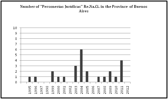 After the reform, the indigenous population becomes a "legal subject". Among the legal arrogations granted, in our case we highlight the impact of the recognition of the indigenous legal status, the possibility to delivery lands suitable for their development and the notion of participation that refers to the management of specific interests. Mentioning the latter, we can describe the fourth aspect that refers to the increase in the number of indigenous legal entities in the recent years and also named as “comunidades indígenas”. According to that, we want to point out how this process brought to the increase and more institutionalized ethno-political practice. Although we understand that the access to the recognition -as a "comunidad indígena" to the State- implies more possibilities for receiving and managing state resources; it also implies differential dynamics that transforms the ethno-political practice and its legitimation in the contemporary leaderships. As for the positive results of those who have the recognition, we can mention the use of resources destined to implement social programs in the communities or projects to strengthen the identity in the urban area, the language or the culture. However, resource management not only stresses the leaders who distribute them to the community members, also has effects in the dynamics that the State recognition establishes between those communities recognized from the non-recognized ones. That situation establishes an arena of high conflict levels between the communities and the interethnic and intercultural spaces. Likewise, the redefinition of the relationship with the State regarding the recognition and management of public resources will signify the collectivization of demands in an ethno-political field with specifically ethnic objectives and claims. This situation of greater organization and visibilisation can be found in the following graph that shows the increase in number of indigenous communities recognized by the Argentine State in the province of Buenos Aires (Table 2).