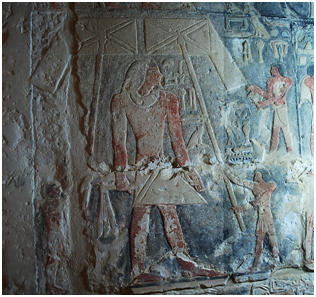 -priest of (the pyramid) ‘Steadfast-are-the places-of-Teti’, etc. This tomb consists of three levels. The top one represents its core, surrounded by an enclosure wall. The second level represents its chapel, which consists of two rock cut courts (the first of which is open and the second is vaulted) and an offering room, cased with limestone from Tura and decorated with daily life scenes. The third level represents its burial chamber, which is also decorated. The offering room is decorated with daily life scenes; fishing, fowling, farming, pastures, poultry-yard, dancing, music, food preparation and presentation, workshop activities (metal workers, making statues, leather workers, etc), relaxation and body care (bed and chair preparation, shaving, manicure and pedicure) and transporting the funeral furniture. It has some intersting, colourful and unique scenes and inscriptions.