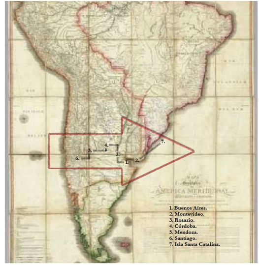 71Geographic Map of South America, Arranged and Recorded by D. Juan de la Cruz Cano and Olmedilla, Geogfo. Thought Of S.M. Individual of the Royal Academy of San Fernando, and gives the Basque Society of the Friends of the Country; Bearing in mind several maps and original news according to Astronomical Observations, Year 1775. London, published by William Faden, Geographer of the King, and Prince of Wales, January 1, 1799. "On this occasion, the commercial route moves from east to west, departing from Santiago to Montevideo, this last place of storage for the supplies with which the expedition counts.