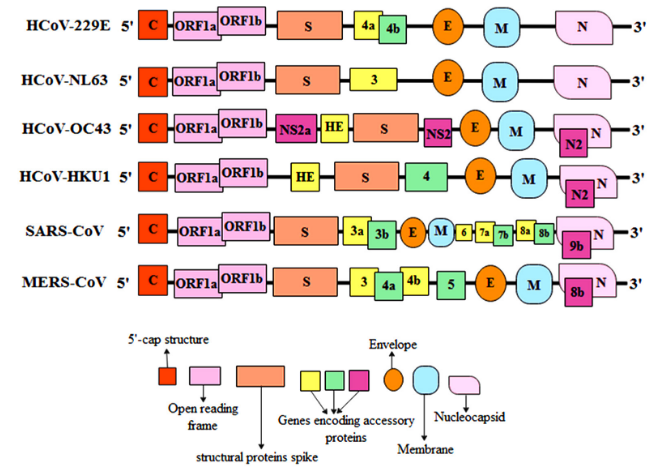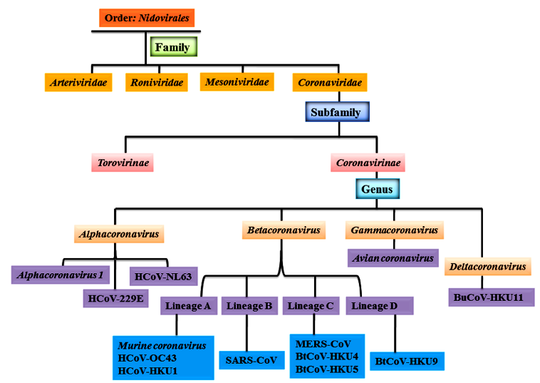 The International Committee on Taxonomy of Viruses (ITCV) classified coronaviruses and put the family Coronaviridae in the order Nidovirales and positioned in subfamily Coronavirinae. According to serological and genomic criteria, Coronavirinae have been divided into four specific genera: Alphacoronavirus, Betacoronavirus, Gammacoronavirus, and Deltacoronavirus.17 In the Betacoronavirus genus 4 discrete lineages (A, B, C, and D) have been positioned. Human coronaviruses such as HCoV-NL63 and HCoV-229E have been assigned to Alphacoronavirus, while HCoV-HKU1 and HCoV-OC43 have been assigned in Betacoronavirus under lineage A, whereas SARS-CoV and MERS-CoV assigned to lineage B and C (Figure 1).