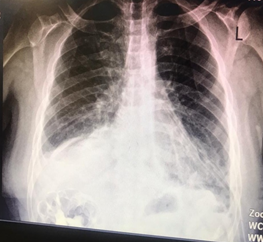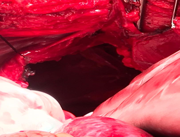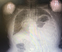The patient underwent surgery, and laparotomy was performed with an upper midline incision. The exploration showed a large defect measuring 10×15 cm in the posterolateral part of the left diaphragm, through which the left kidney, spleen, small intestinal loops, and part of the colon were displaced into the thoracic cavity. Adhesions were released, and all viscera were pulled down to the abdomen without any problem (Figure 3). The defect site was repaired with a dual mesh so that the mesh was sewn to the diaphragm and chest wall with 0-1 prolene suture with sufficient overlap. A 28-inch chest tube was inserted into the left thorax. The Postoperative chest X-ray is shown in Figure 4. The patient was in the ICU for 1 day after surgery and 3 days in the ward.