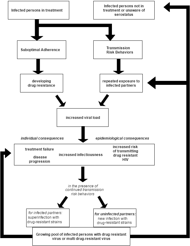 HIV+ individuals who continue to engage in transmission risk behaviors, including unprotected sex and sharing needles/ drug equipment, place their negative partners at high risk of infection with HIV, including drug-resistant HIV (HIVDR). Studies have documented concerning numbers of treatment-naïve patients presenting with HIVDR,33 which they could only have acquired from an HIV+ partner who had such resistance. Suboptimal adherence to ART facilitates the selection and emergence of mutated and drug resistant strains of HIV, a significant and by now, extensively documented problem which compromises effective ART, leading to treatment failure and ultimately, disease progression.34 Moreover, HIV drug resistance (HIVDR) complicates ART, in that resistance to some drugs may confer cross-resistance to other classes of ARVs.35